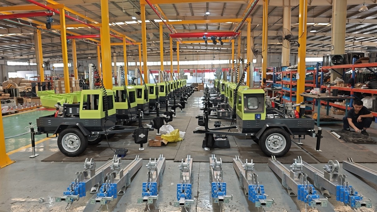某國外客戶經(jīng)過考察對比,先購買我廠3臺移動照明車進(jìn)行試用,試用效果十分滿意,經(jīng)過評估又繼續(xù)追加27臺,以下為生產(chǎn)裝配現(xiàn)場